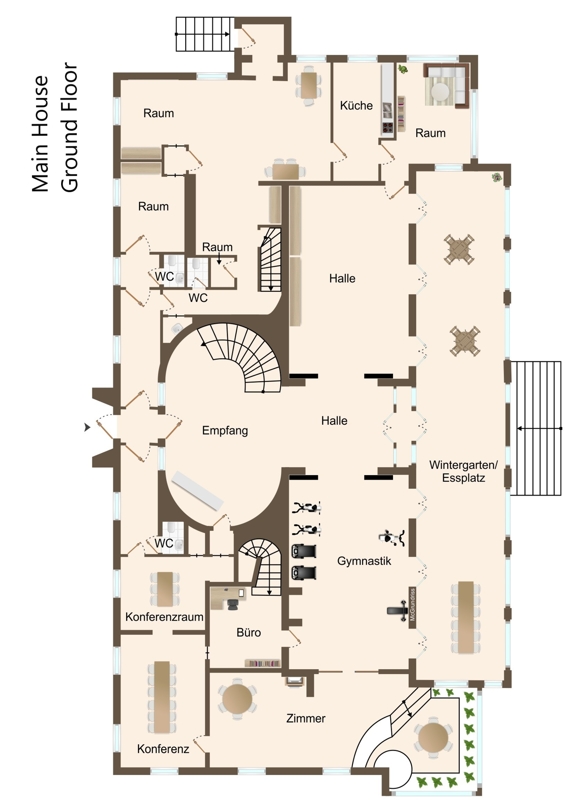 1. Stock: Große Küche inkl. Buffet Zimmer, Eingangshalle, 3 große Essbereiche