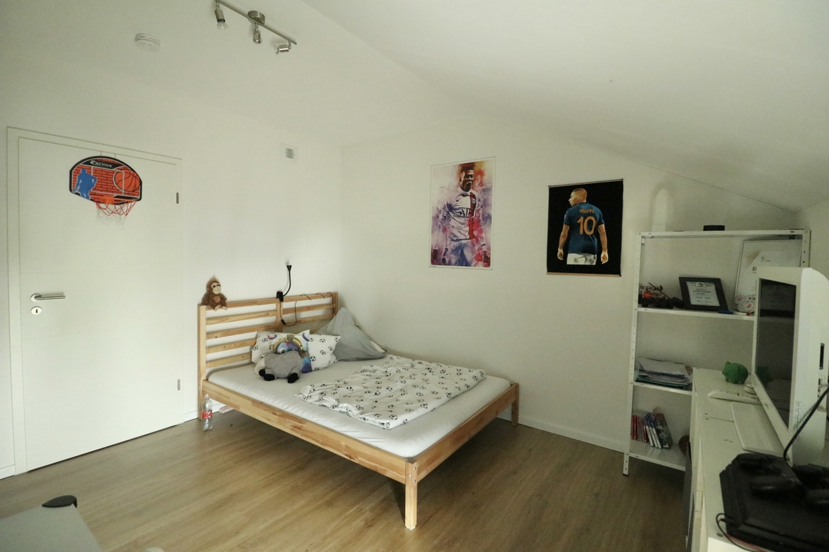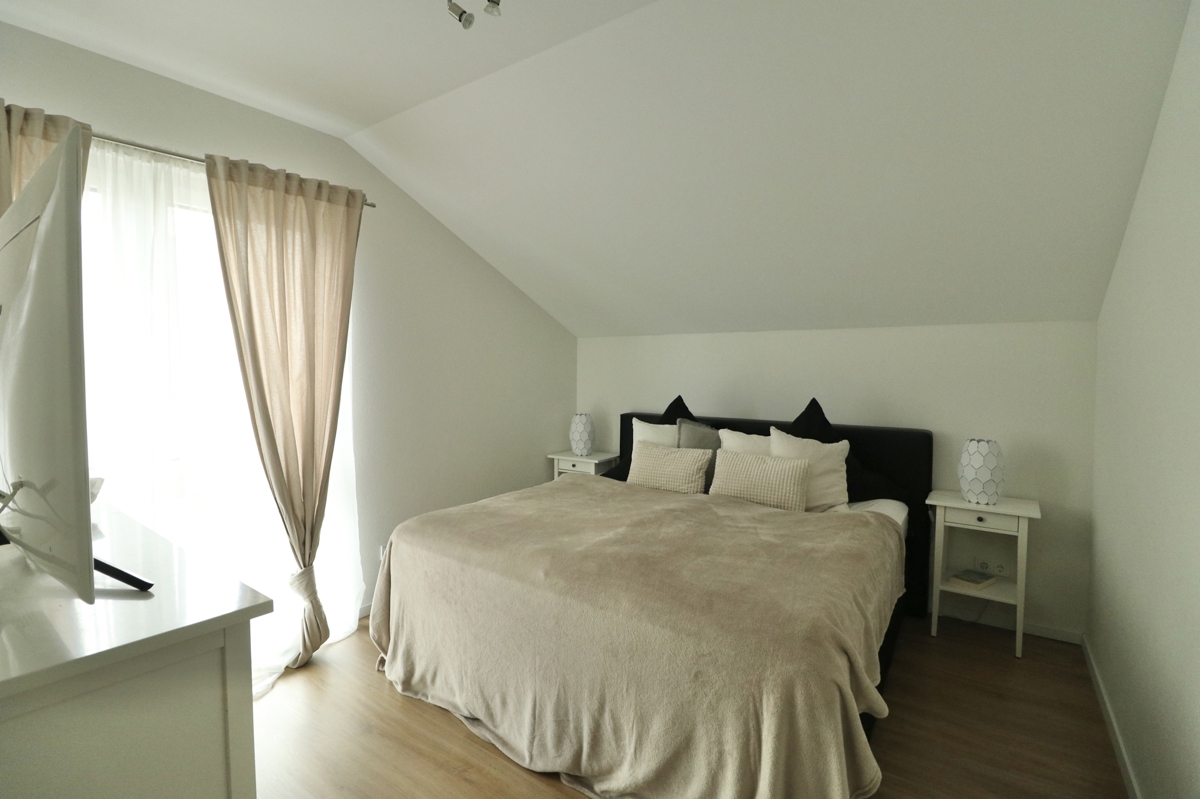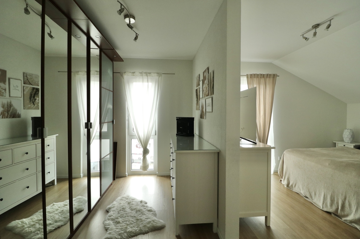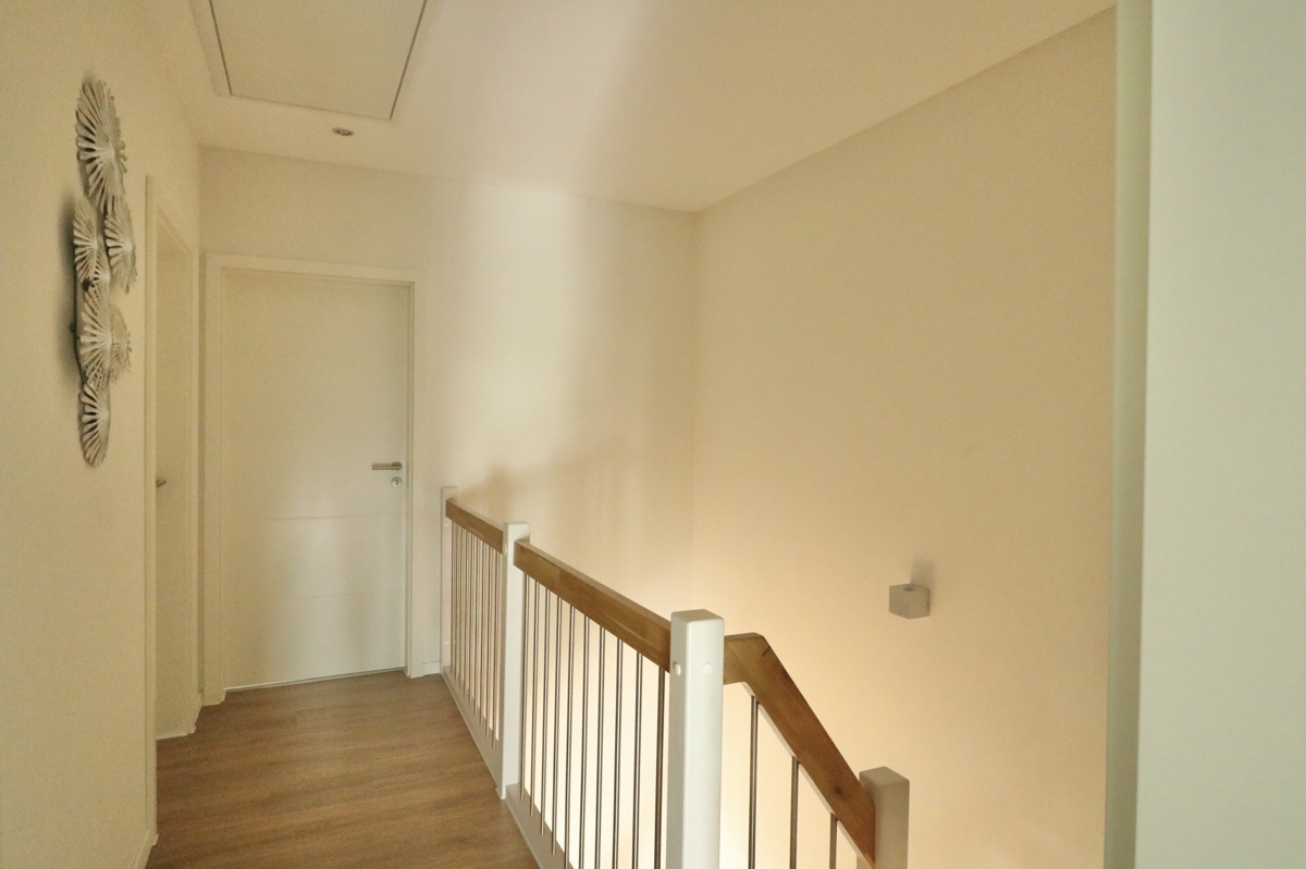 DG: Im DG erwarten Sie drei Schlafzimmer: Zwei Kinderzimmer und das Elternschlafzimmer mit großem Ankleideraum. Ebenfalls auf dieser Etage befindet sich ein großes Tageslichtbadezimmer mit Badewanne, Dusche, Waschtisch und WC. Über eine Luke und Leiter in der Decke im Flur des DGs haben Sie Zugang zum Dachboden, der Ihnen weiteren Stauraum bietet.