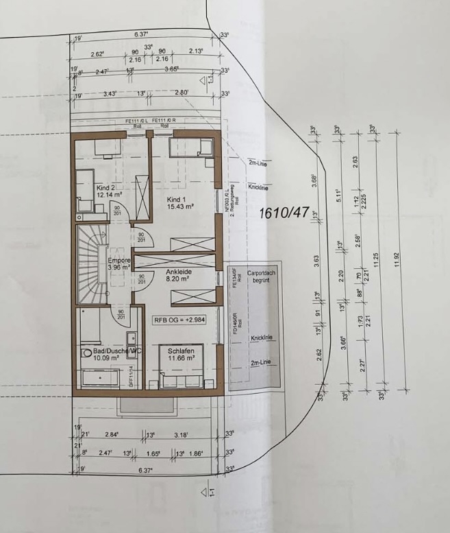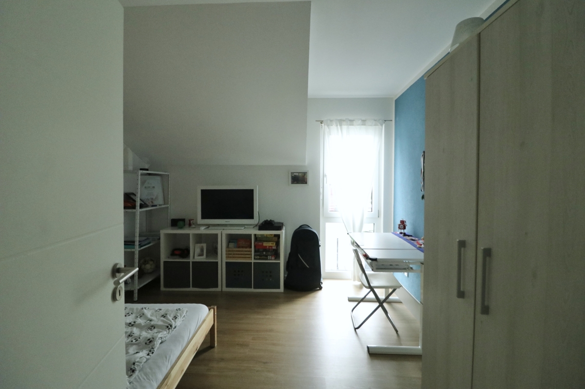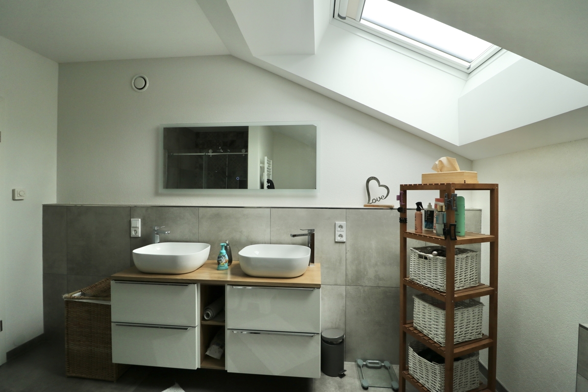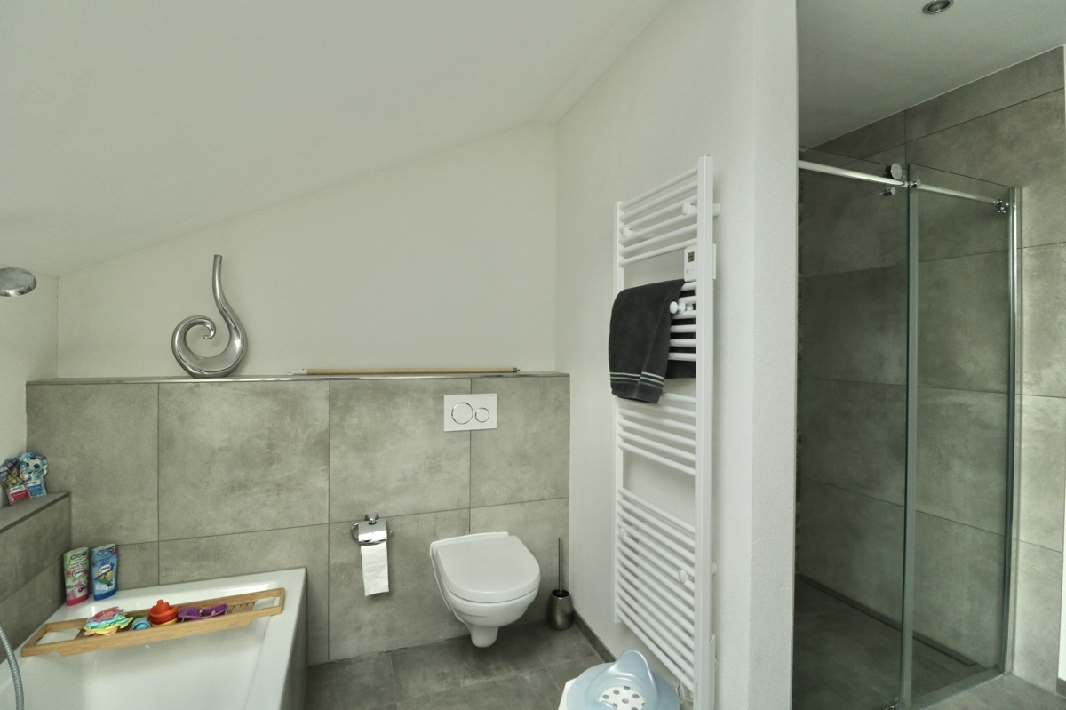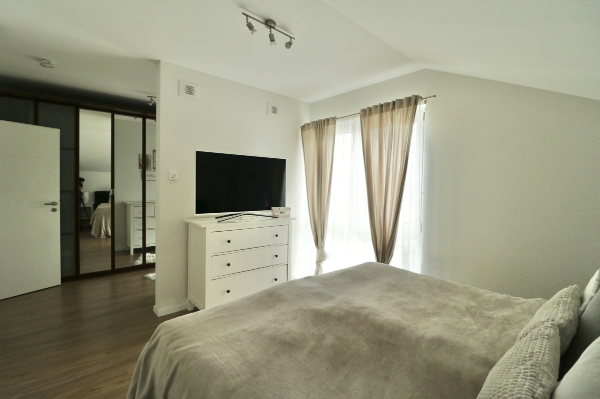 DG: Im DG erwarten Sie drei Schlafzimmer: Zwei Kinderzimmer und das Elternschlafzimmer mit großem Ankleideraum. Ebenfalls auf dieser Etage befindet sich ein großes Tageslichtbadezimmer mit Badewanne, Dusche, Waschtisch und WC. Über eine Luke und Leiter in der Decke im Flur des DGs haben Sie Zugang zum Dachboden, der Ihnen weiteren Stauraum bietet.
