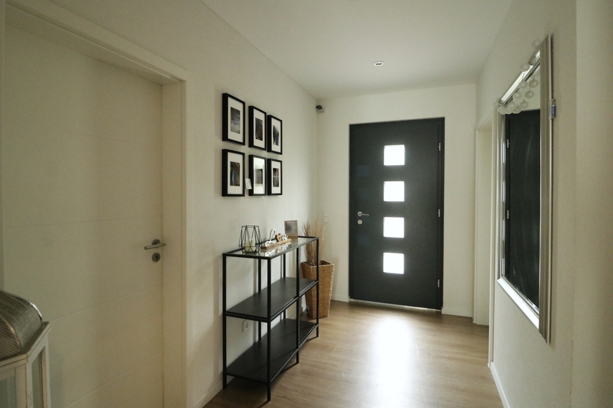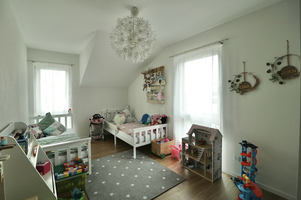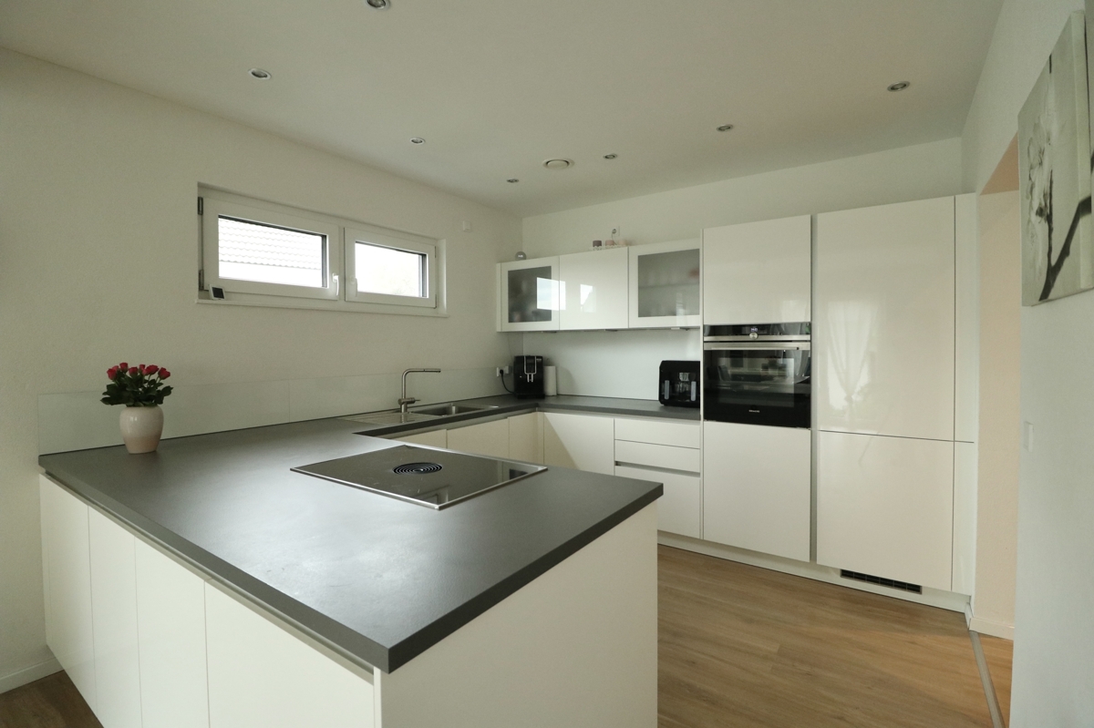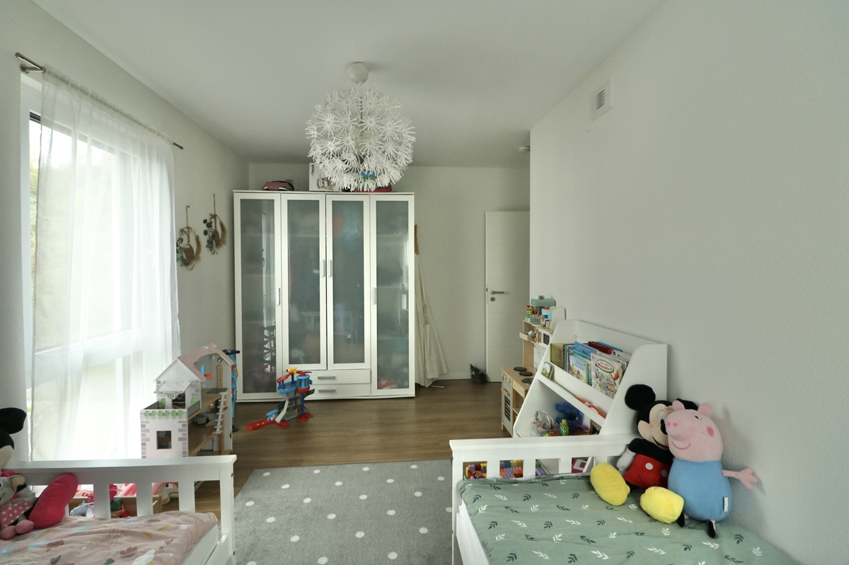 Dieses neuwertige Bien Zenker Energiesparhaus KfW 55 Baujahr 2020 mit einer Luft-/Luft Wärmepumpe u. Photovoltaik-Anlage, befindet sich in sehr schöner Lage von Rheinfelden-Karsau u. bietet Ihnen einen hochwertigen u. energetisch TOP-modernen Wohnstandard. Die Doppelhaushälfte steht auf einem Grundstück mit ca. 216 m2.Auf zwei Wohnetagen mit ca. 127 m² Wohnfläche finden Sie drei Schlafräume, ein großes Wohn-/Esszimmer, eine offene Küche mit hochwertiger EBK sowie ein Tageslichtbadezimmer mit Badewanne u. Dusche u. ein Gäste-WC. Am Elternschlafzimmer befindet sich zudem ein Ankleideraum. Im EG bietet Ihnen ein großer Haustechnik Raum, mit Anschlüssen für Waschmaschine u. Trockner, zusätzlichen Stauraum. Weiteren Stauraum haben Sie im Dachboden der Immobilie. Die Wohnräume sind mit bodentiefen 3-fachverglasten Fenstern ausgestattet. Im EG mit elektr. Jalousien mit Smart Home Funktion für die Jalousien u. Beleuchtung. Die gesamte Doppelhaushälfte verfügt über Lan-Verkabelung. Die Böden sind mit hochwertigem Vinyl in Holzoptik u. Fliesen im Bad und WC ausgestattet.