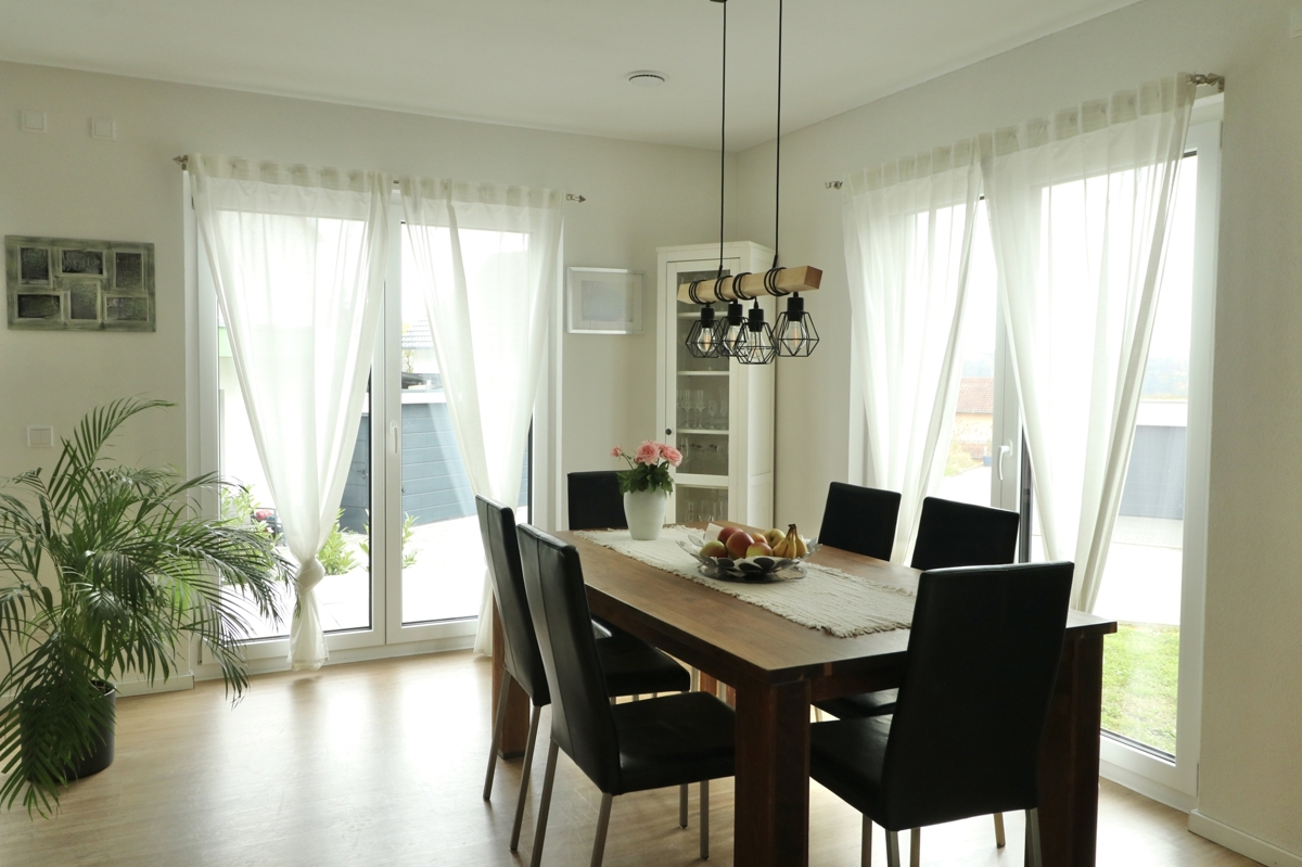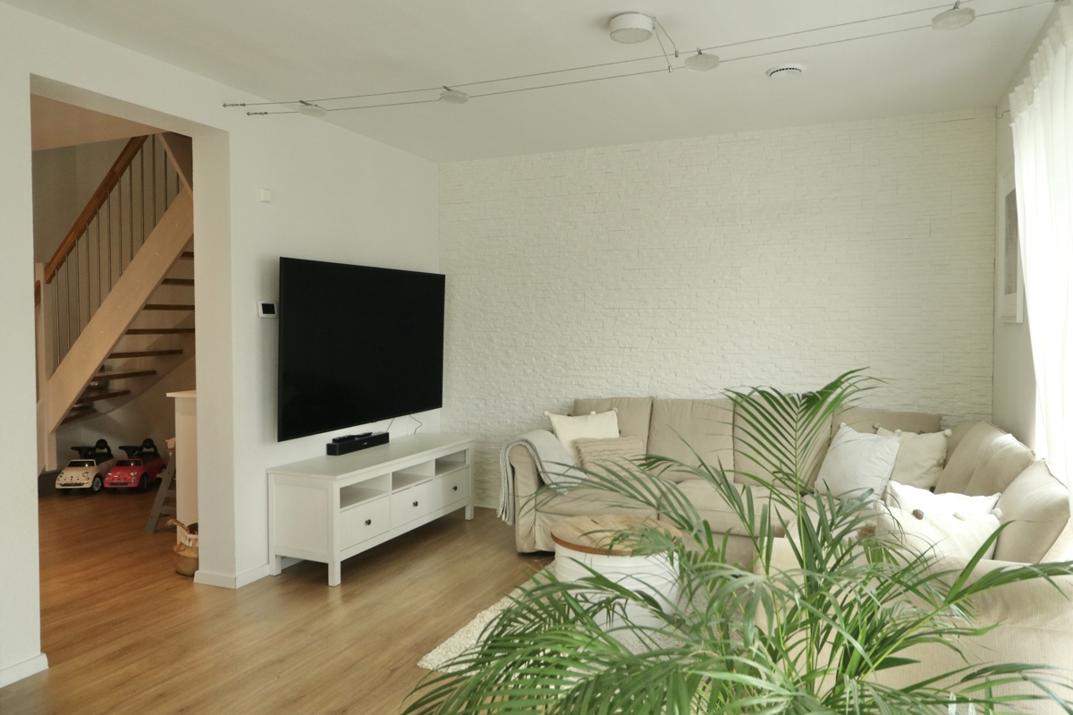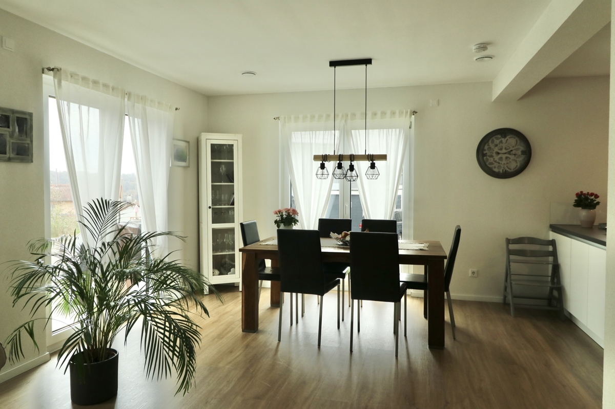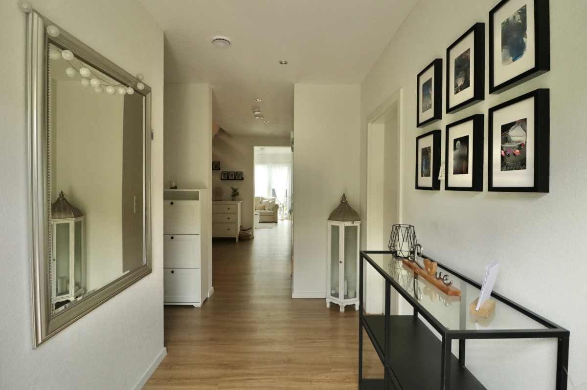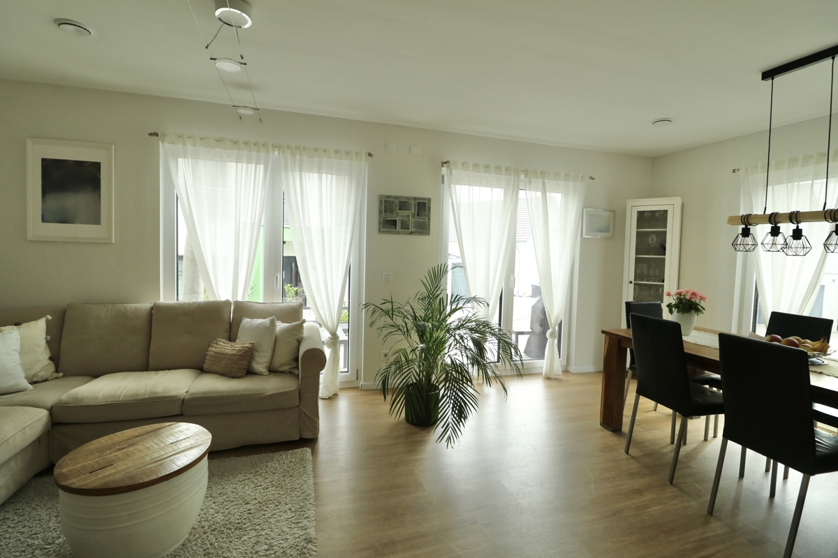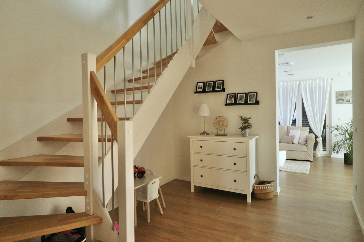 Über den Eingangsbereich und die helle Holztreppe haben Sie Zugang zu allen Etagen der Immobilie:EG: Vom Flur des EGs kommen Sie in das großzügige, helle Wohn-/Esszimmer mit großen Fensterflächen und Zugang zur Terrasse hinter dem Haus. Der Raum bietet Platz für Wohn-/Esszimmermöbel u. Sofagarnitur, angrenzend daran befindet sich die offene Küche mit moderner, hochwertiger EBK. Das EG verfügt über einen Garderobenbereich, ein Gäste-WC sowie den Haustechnikraum mit der modernen Heizanlage sowie Anschlüssen für Waschmaschine und Trockner und zusätzlichem Stauraum.