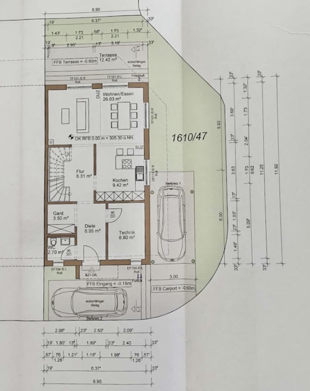 Zur Immobilie gehören eine große Terrasse mit Zugang vom Wohn-/Esszimmer aus sowie zwei Stellplätze. Ein Stellplatz kann mit einem Carport überdacht werden. Anschlussmöglichkeit für eine Walbox ist ebenfalls vorhanden.