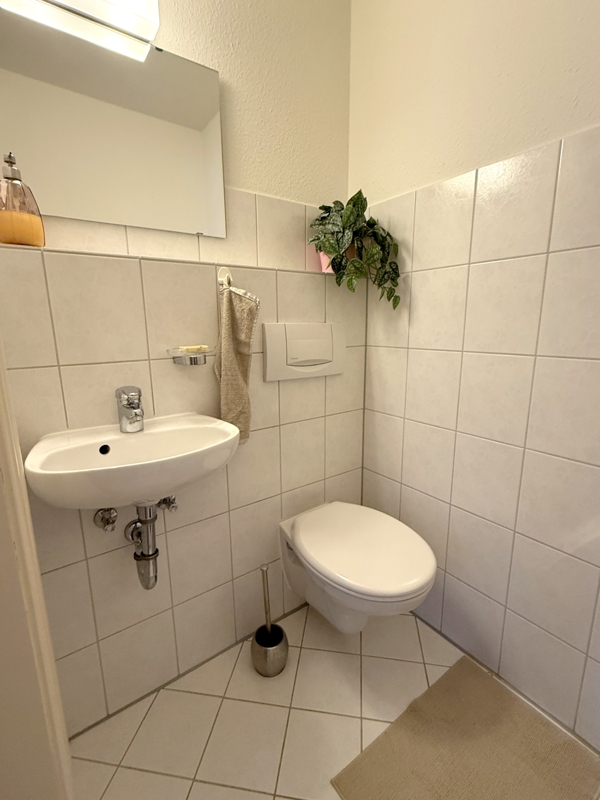 Das Badezimmer ist mit einer Badewanne und einem praktischen Waschmaschinenanschluss ausgestattet,. Die Toilette befindet sich separat und sorgt für zusätzlichen Komfort.