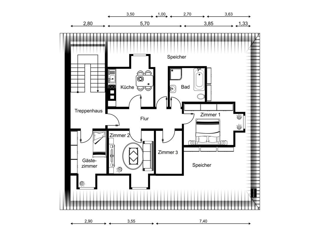 Diese Dachgeschosswohnung aus dem Jahr 1936 wurde 1959 modernisiert und bietet eine ideale Mischung aus historischem Charme und modernem Komfort. Mit einer Wohnfläche von ca. 55 m² umfasst die Wohnung drei Zimmer, darunter zwei Schlafzimmer, ein Wohnzimmer, eine Küche und ein Badezimmer. Des Weiteren steht Ihnen innerhalb der Wohnung ein Zugang zum Speicher zur Verfügung. Die Fläche bietet zusätzlichen Stauraum und die Möglichkeit, die Wohnung zu erweitern, um mehr Wohnraum zu schaffen.Die Etagenheizung wird mit Gas betrieben, was für wohlige Wärme sorgt und gleichzeitig energieeffizient ist.
