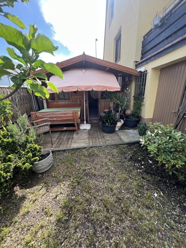 Der Garten, inklusive einer gemütlichen Garten-Laube, kann bei Regen- und Sonnenstunden zur Entspannung dienen.