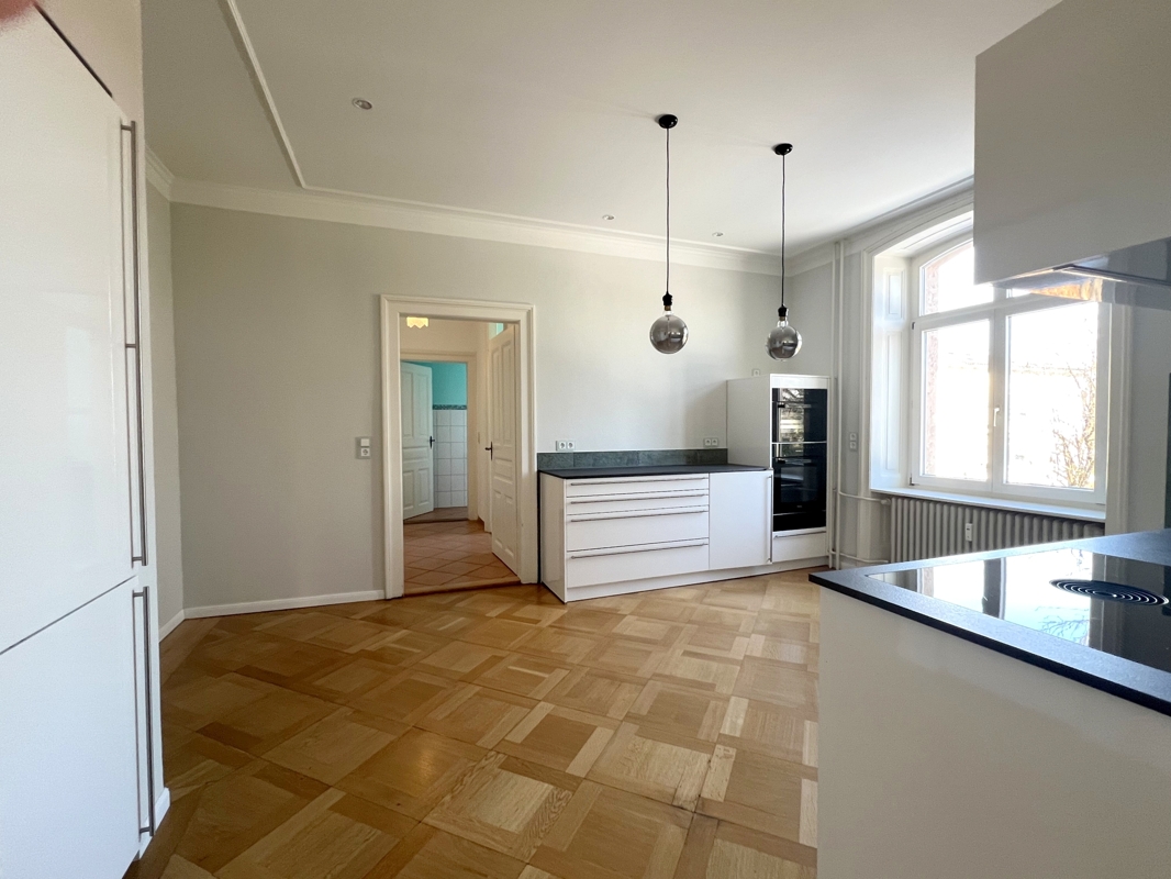 Das Herzstück der Wohnung ist der großzügige Wohn- und Essbereich, der mit seinen hohen Decken, kunstvollen Stuckverzierungen und großen Fenstern ein stilvolles und einladendes Ambiente bietet.