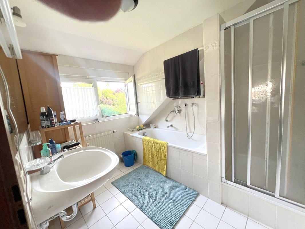 Auf einer Wohnfläche von ca. 227 m² befinden sich eine Erdgeschosswohnung und eine Dachgeschosswohnung, die Sie durch den hinter dem Haus liegenden Eingang betreten können. Somit haben Sie viele Gestaltungsmöglichkeiten, um diesen Wohnraum optimal zu nutzen. Die Dach- und Erdgeschosswohnung verfügen über ein Badezimmer, welche jeweils mit 2 Waschbecken, einer Dusche und einer Badewanne ausgestattet sind. Das WC befindet sich jeweils in einem separat.