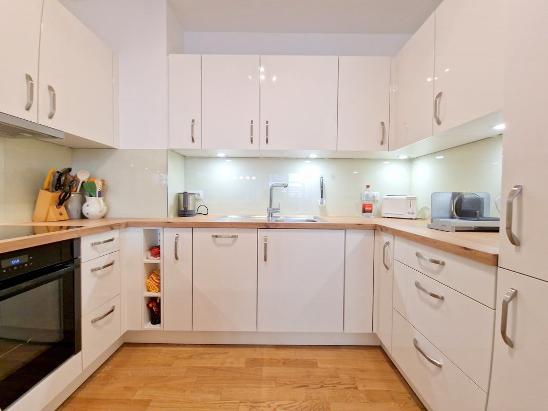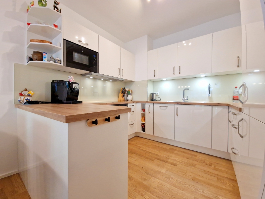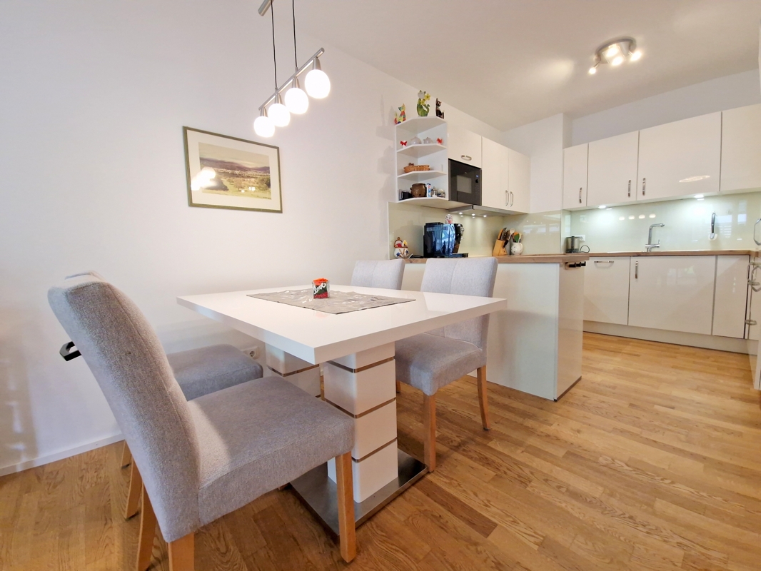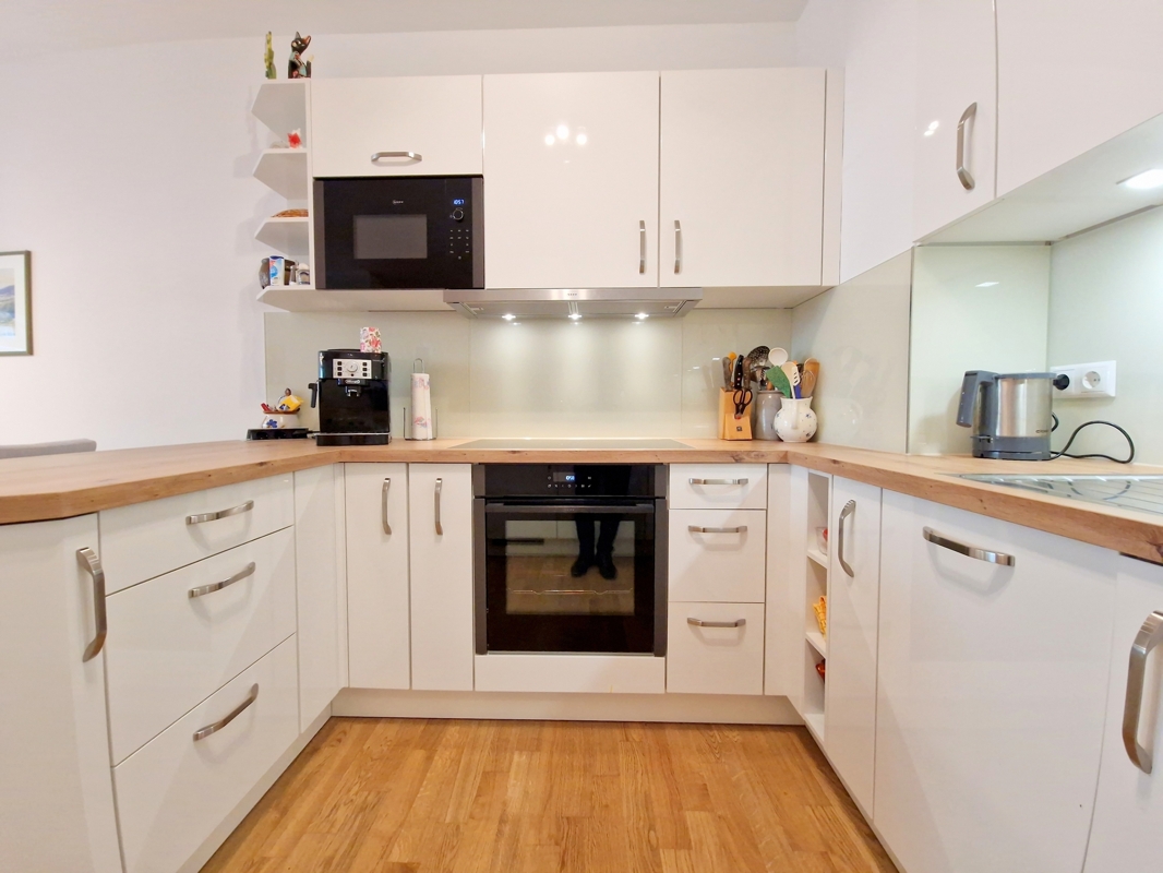 Die hochwertige Einbauküche ist modern ausgestattet und verfügt über sämtliche Elektrogeräte. Das Badezimmer präsentiert sich ebenfalls modern mit bodengleicher Dusche, Waschmaschinenanschluss und geschmackvoller Ausstattung.