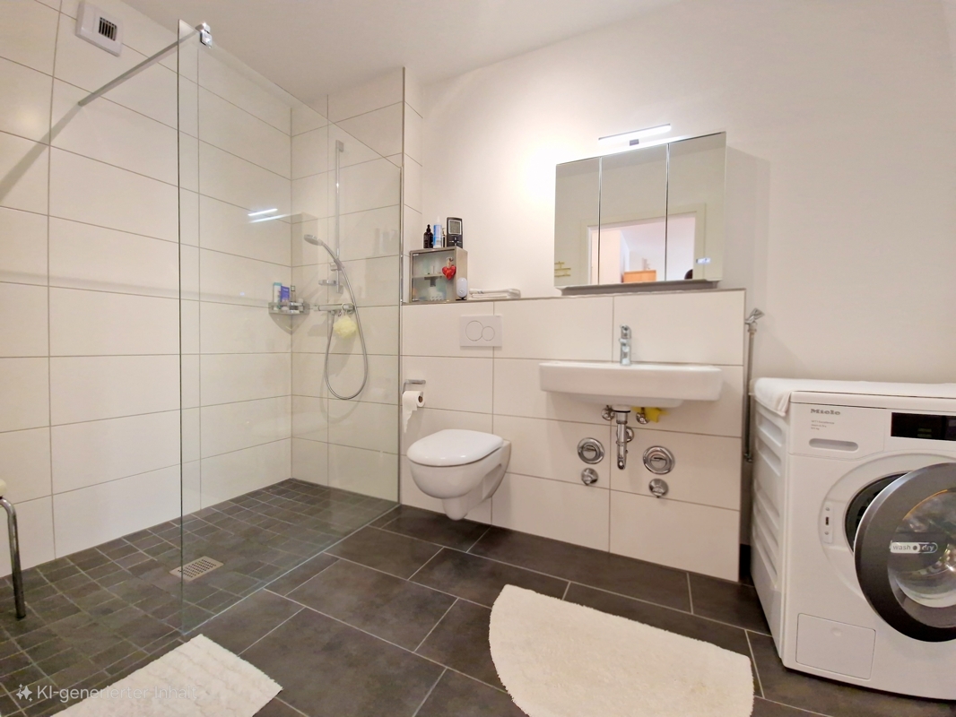 Modernes Bad mit Dusche und Waschmaschinenanschluss