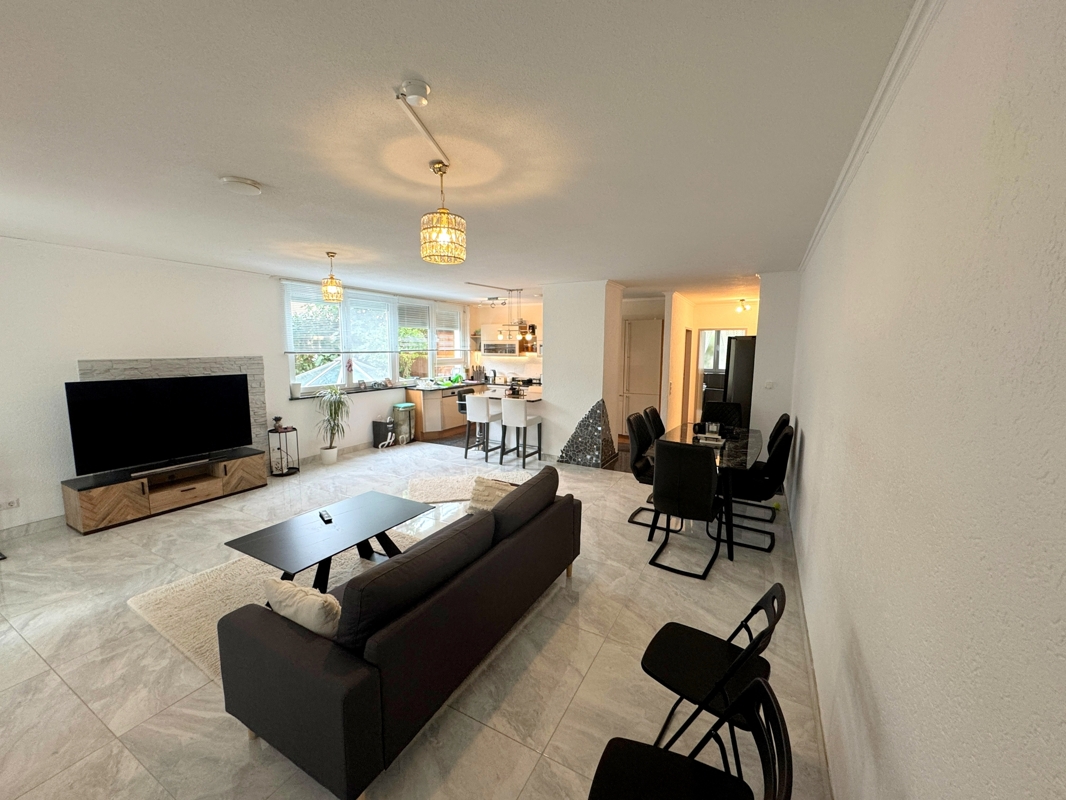 Diese exklusive Wohnung erstreckt sich auf ca. 124 m² Wohnfläche und besticht durch eine großzügige Raumaufteilung sowie lichtdurchflutete Wohnbereiche. Das Herzstück bildet der etwa 42 m² große Wohn- und Essbereich mit offener, modern gestalteter Küche, die optimalen Stauraum bietet und sich ideal für gemeinsames Kochen und geselliges Beisammensein eignet. Große Fensterfronten durchfluten die Räume mit Tageslicht und schaffen eine freundliche, helle Atmosphäre. Vom Wohnzimmer aus gelangt man direkt auf die rund 23 m² große überdachte Terrasse und in den umlaufenden Garten, die als Erweiterung des Wohnraums Ruhe und Erholung im Freien ermöglichen.Die Wohnung verfügt über drei helle Schlafzimmer, eines mit direktem Zugang zur Terrasse, sowie zwei Badezimmer – ein Hauptbad mit Badewanne, WC, Waschbecken und Waschmaschinenanschluss und ein zweites Bad mit Dusche, WC und Waschbecken. Zwei Gartenhütten bieten zusätzlichen Stauraum, und ein separates Kellerabteil sowie ein Tiefgaragenstellplatz runden das Angebot ab.
