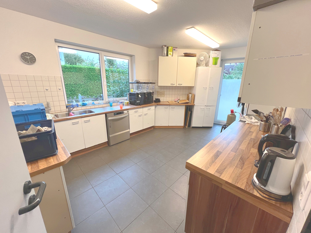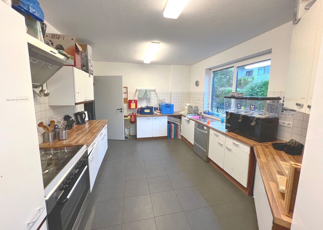 Eine sehr große Küche mit einer hochwertigen Einbauküche, die sowohl als Mitarbeiterräume oder Gemeinschaftsküche ideal geeignet ist.