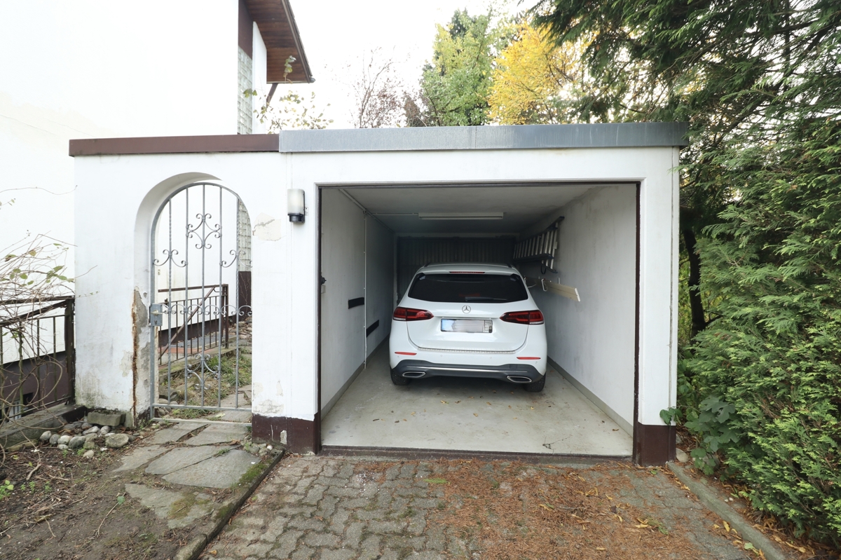 Zur Immobilie gehört eine Einzelgarage mit elektrischem Rolltor mit einem angebauten Schopf für Gartengeräte und Fahrräder sowie einer Stellplatzfläche vor der Garage.